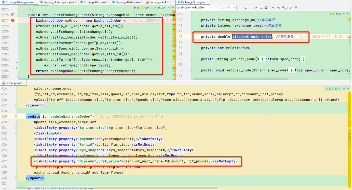最近改bug或者做需求的时候遇到相当糟心的代码,我们和数据库打交道采用的是ibatis框架,截图的代码是有问题的,可以看到bean 的变量 **discount_unit_price** 是通过基本类型声明的,这样会有个问题,基本类型的变量如果没有赋值,默认会有一个初始值,这边 **discount_unit_price** 如果没有赋值的情况下,默认是0。而 **updateExchangeOrder()** 里面虽然在构造的 **ExchangeOrder** 对象的时候,虽然业务上看起来是没有对 **discount_unit_price** 做更新的处理,xml 里面也做了非空判断,一切看起来好像都没有问题, 但是忽略了 **discount_unit_price** 基本类型初始值为0的情况,导致每次调用这个方法,都会将原有的 **discount_unit_price** 的值覆盖为0。