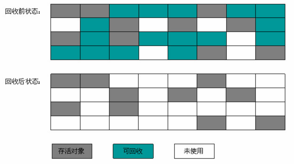 缺点:1.从效率上来说,标记-整理算法要低于复制算法;2.移动对象的同时,如果对象被其他对象引用,则还需要调整引用的地址。3.移动过程中,需要全程暂停用户应用程序,即:STW。