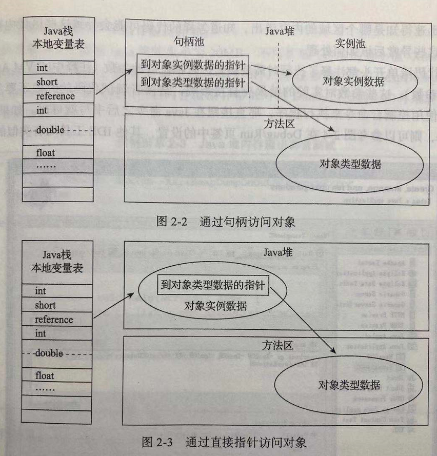 JAVA程序会通过栈里面的局部变量表存储的reference数据(对象引用),来操作堆上具体的对象,HotSpot虚拟机采取的对象引用主要通过直接指针访问的方式来实现(其他类型的虚拟机有的采用句柄的方式),reference中存储的直接就是对象地址,它的好处就是访问速度块。   句柄指针: 如果使用句柄访访问的话,JAVA堆中将可能会划分出一块内存来作为句柄池,reference中存储的就是对象的句柄地址,而句柄中包含了对象实例数据与类型数据各自具体的地址信息。   直接指针: 如果使用直接指针的话,JAVA堆对象中的内存布局就必须考虑如何放置访问类型数据的相关信息,reference中存储的直接就是对象地址,如果只是访问对象本身的话,就不需要多一次简介访问的开销,如图2-3。   这两种访问各有优势,使用句柄来访问的足底啊好处是reference存储的是稳定的句柄,在对象被移动(垃圾回收,标记-复制,改变对象内存的地址值)时,只会改变句柄中的实例数据指针,而reference不需要修改。而使用直接指针访问的最大好处是访问速度更快。