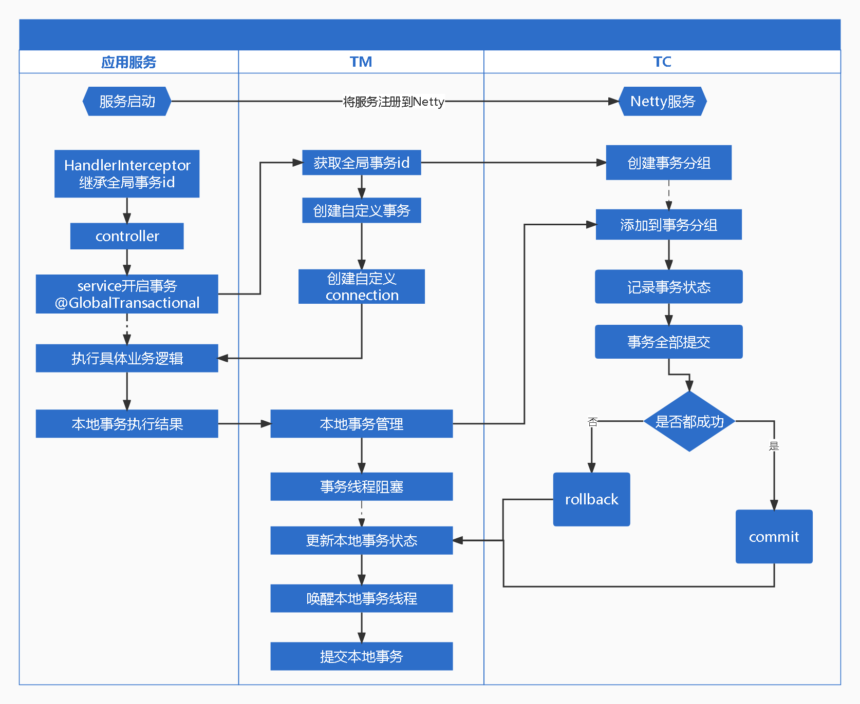 TM嵌入具体应用服务,通过切面获取到数据库connection的控制权,并且在提交事务之前将本地事务情况汇报给远程TC, 然后重开一条线程进入等待状态,等待远程TC唤醒线程。 TC通过全局事务id进行分组,当最后一个事务提交汇报后, 判断该分组下的所有事务状态是否都是成功,如果有其中一个失败,那么便下发全部回滚的状态,应用服务通过监听,接收 到回滚状态,唤醒事务线程执行回滚。